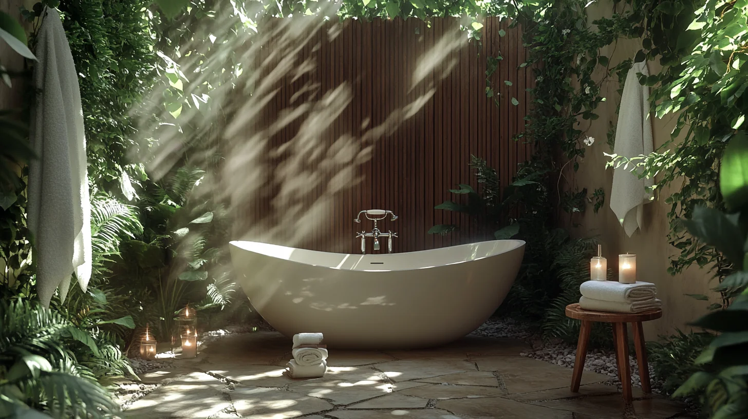 N’oublions pas les accessoires qui complètent le tableau. Des robinetteries en acier inoxydable, des luminaires délicats, et des meubles en teck ou en bambou ajoutent une touche de sophistication. Pensez aussi aux éléments de chauffage, comme les braseros ou les chauffages d’extérieur, pour profiter de votre salle de bain même par temps frais.
